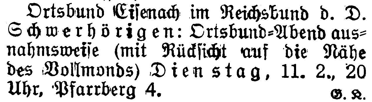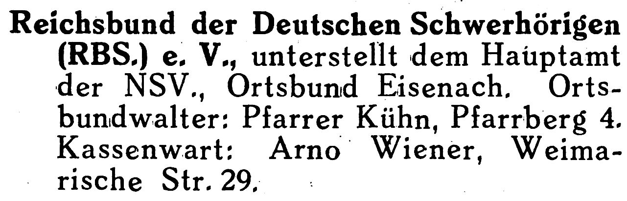 "Aus Luthers lieber Stadt" (bis 1941, letzter Eintrag) und in den Adressbüchern von Eisenach (bis 1943) zu finden. Der letzte ermittelte Eintrag findet sich unter "Kirchliche Einrichtungen" als "Reichsbund der Schwerhörigen (RBS), Ortsbund Eisenach". Dann verlieren sich die Spuren im Zweiten Weltkrieg.