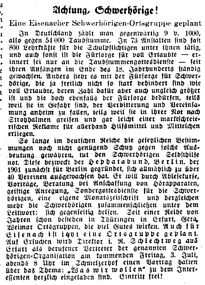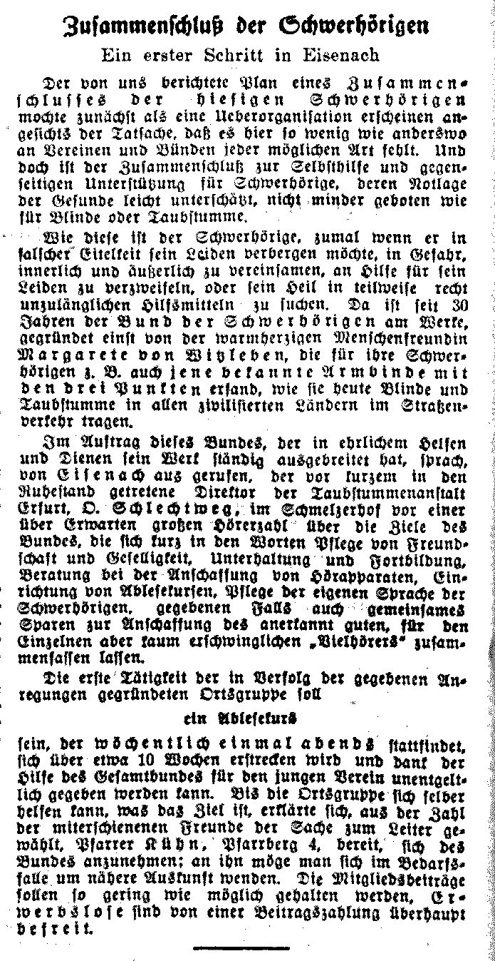Die Anfänge des Schwerhörigen-Vereins Eisenach reichen aber noch weiter zurück, denn bereits seit 1931 gab es einen Schwerhörigen-Verein, dessen Vorsitzender Pfarrer Gerhard Kühn war. Am 1. Juli 1931 gab es in der "Eisenacher Zeitung" einen Aufruf zum Treffen im Schmelzerhof, und am 6. Juli 1931 wurde mit der Überschrift "Zusammenschluß vollzogen" über die Gründung berichtet. Spuren dieses Ortsvereins des von Margarethe von Witzleben begründeten "Hephata-Bundes" sind im Eisenacher evangelischen Gemeindeblatt